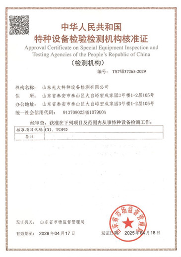 山東光大特種設(shè)備檢測(cè)有限公司是經(jīng)山東省市場(chǎng)監(jiān)督管理局核準(zhǔn)的甲類(lèi)B1特種設(shè)備綜合檢驗(yàn)機(jī)構(gòu)。2017年9月30日取得了山東省市場(chǎng)監(jiān)督管理局頒發(fā)的《檢驗(yàn)檢測(cè)機(jī)構(gòu)資質(zhì)認(rèn)定證書(shū)》。2018年2月22日取得了山東省市場(chǎng)監(jiān)督管理局頒發(fā)的《特種設(shè)備檢驗(yàn)檢測(cè)機(jī)構(gòu)核準(zhǔn)證》(起重機(jī)械)檢驗(yàn)檢測(cè)資質(zhì)。2021年11月取得山東省市場(chǎng)監(jiān)督管理局版發(fā)的《特種設(shè)備檢驗(yàn)檢測(cè)機(jī)構(gòu)核準(zhǔn)證》(安全閥在線、離線)校驗(yàn)資質(zhì)。2023年11月取得山東省市場(chǎng)監(jiān)督管理局頒發(fā)的甲類(lèi)檢驗(yàn)機(jī)構(gòu)B1《特種設(shè)備檢驗(yàn)檢測(cè)機(jī)構(gòu)核準(zhǔn)證》,具有壓力容器(RD2...